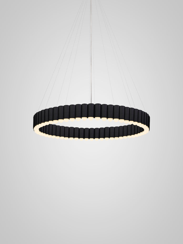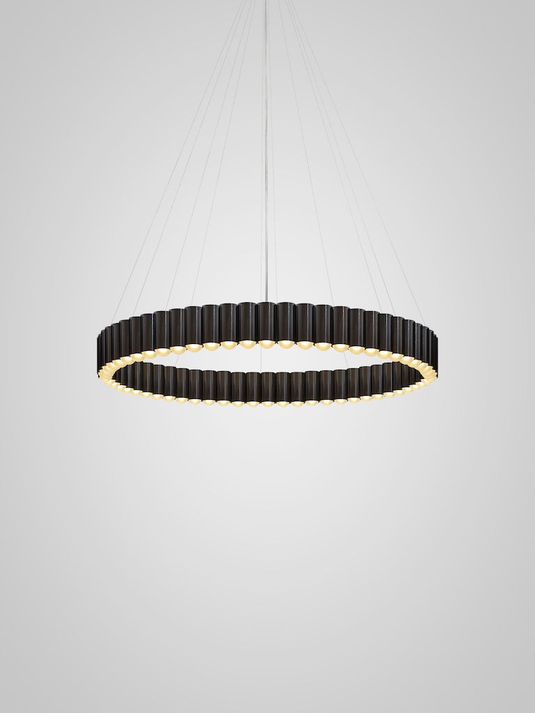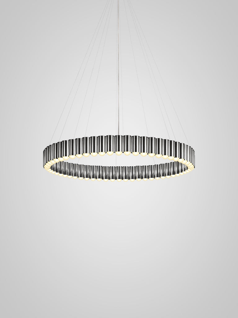 Inspired by the merry-go-round ride of a traditional British fairground. Cylinders house an inset LED lighting element resulting in a spectacular ring of light. Carousel XL is suspended from a matching circular ceiling plate by steel suspension wires with a single clear cable.