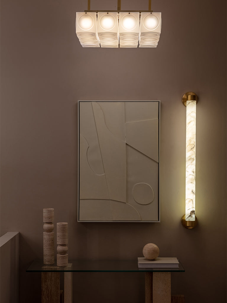 Inspired by the pressed glass bricks often used as an alternative to stained glass in places of worship during the 1970s, Chant is formed of blown glass cubes with a pronounced circular detail in either clear or frosted glass. Constructed in square configurations, the glass cubes connect to form glowing brick-like chandeliers in single or two tiers.
