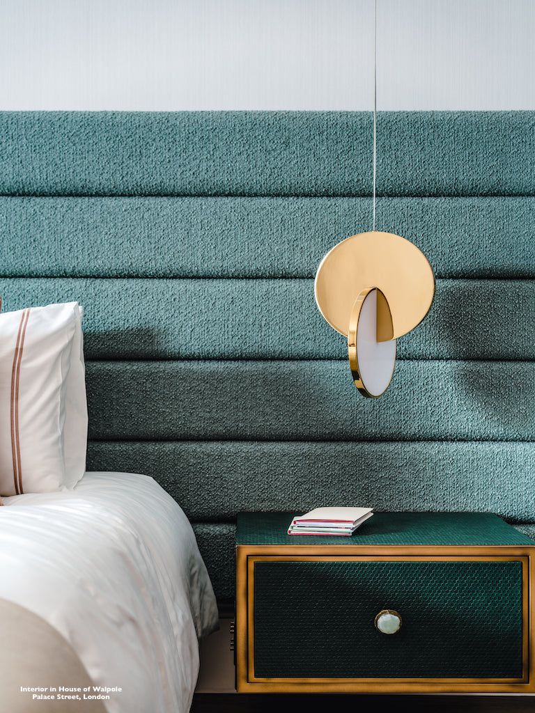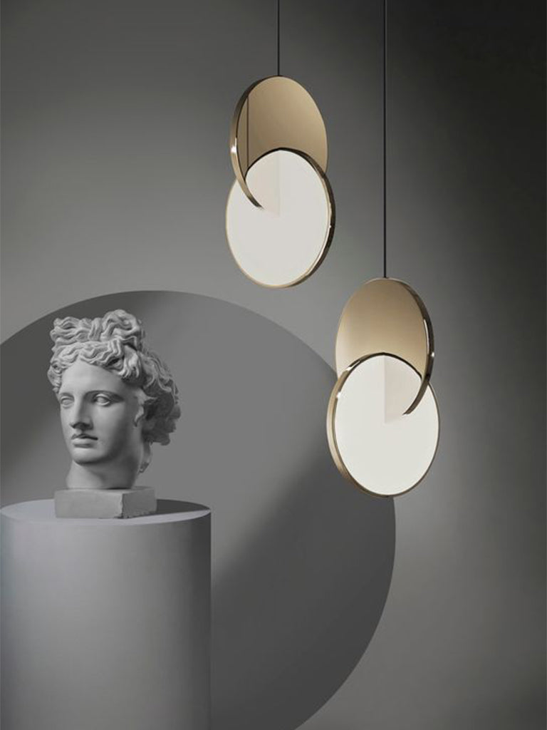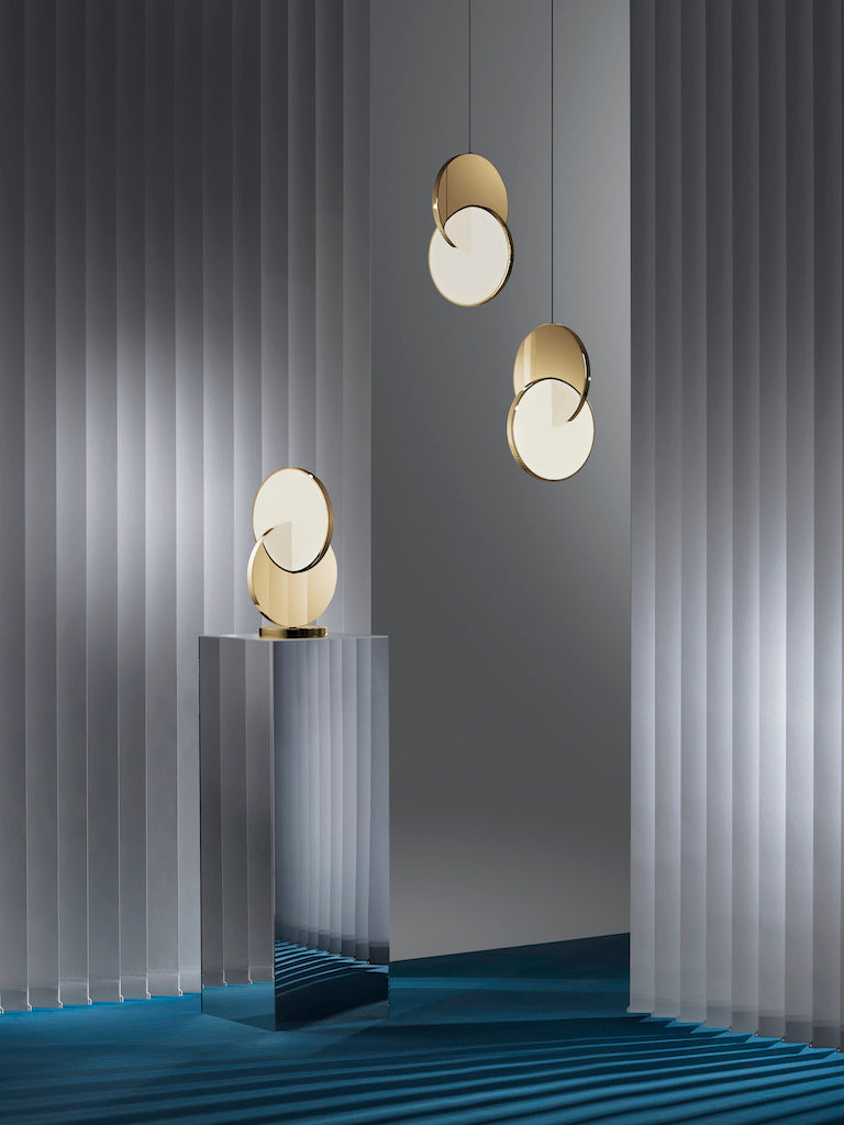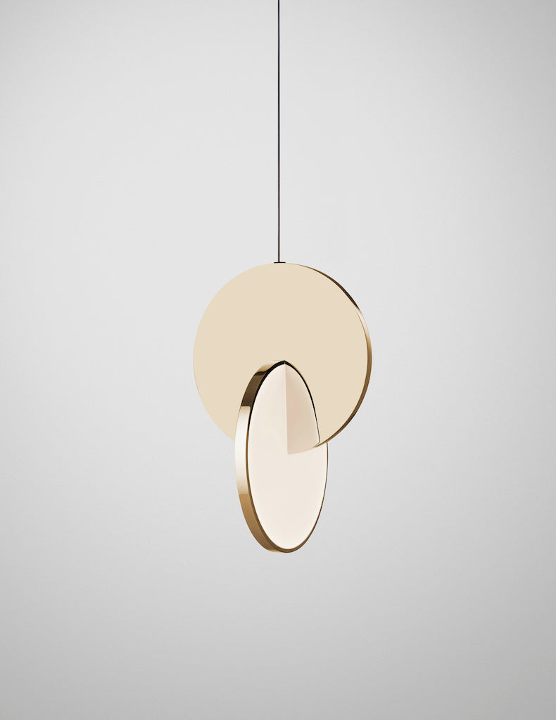 Eclipse Pendant is celestial in both its name and inspiration. Mirror-polished gold and acrylic discs interact, dissect and obscure, which both eclipses and reveals its illumination to the viewer at the same time.