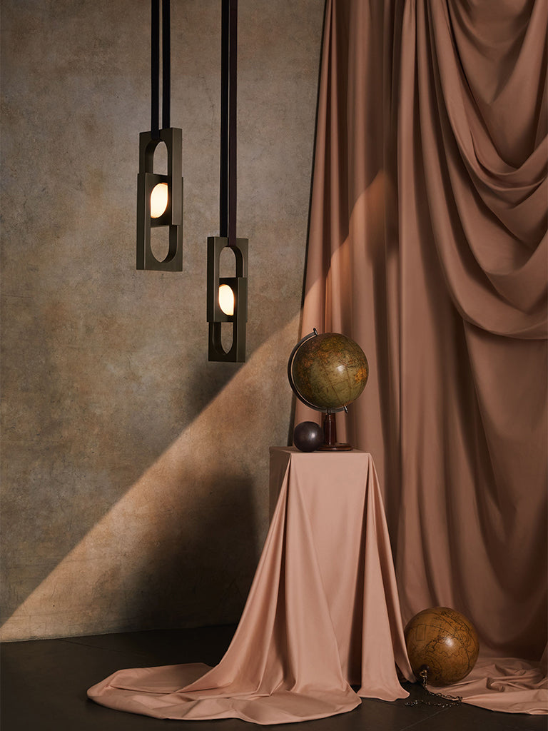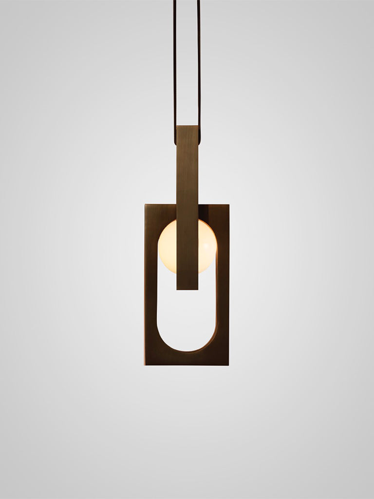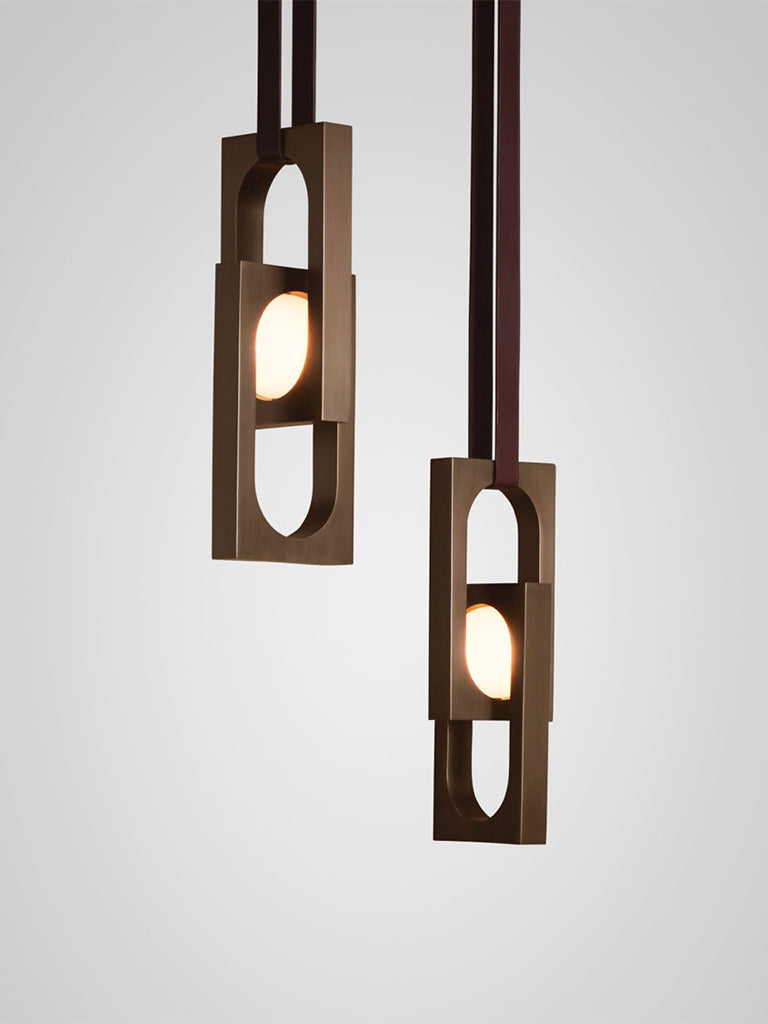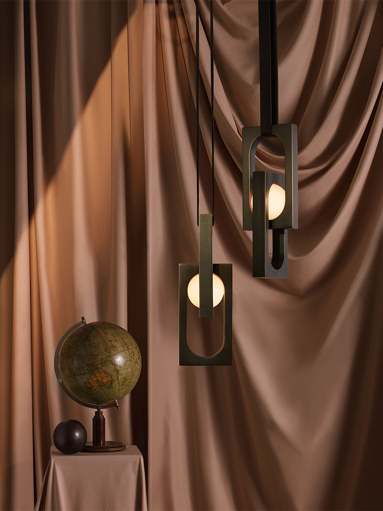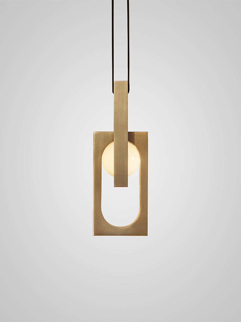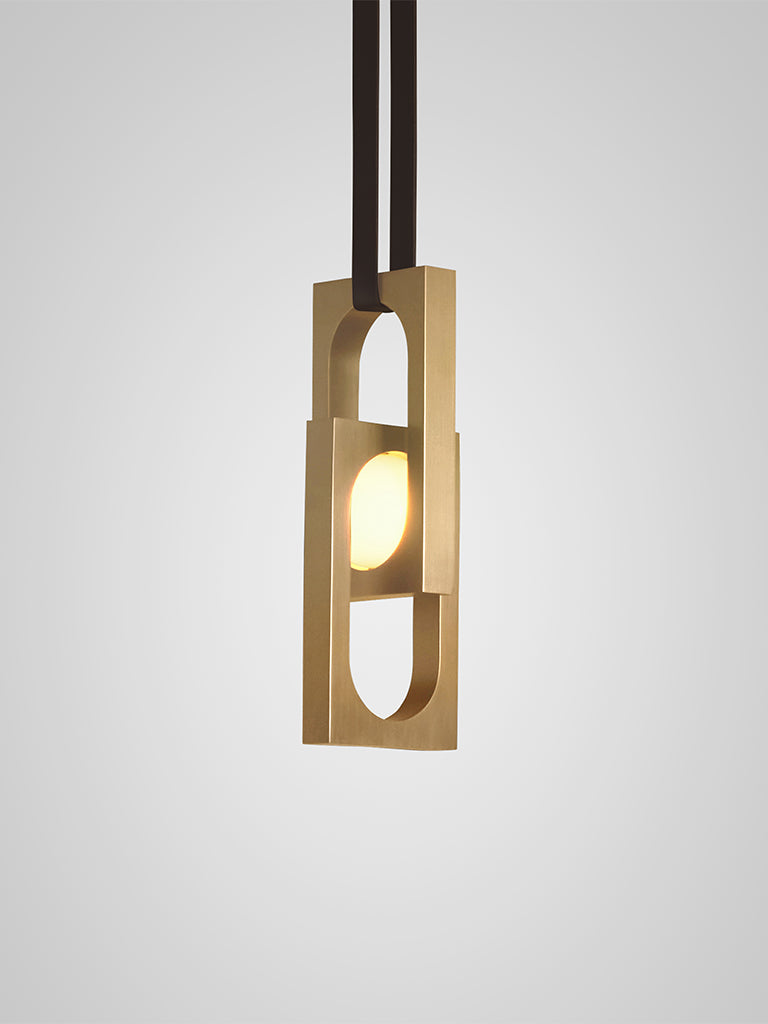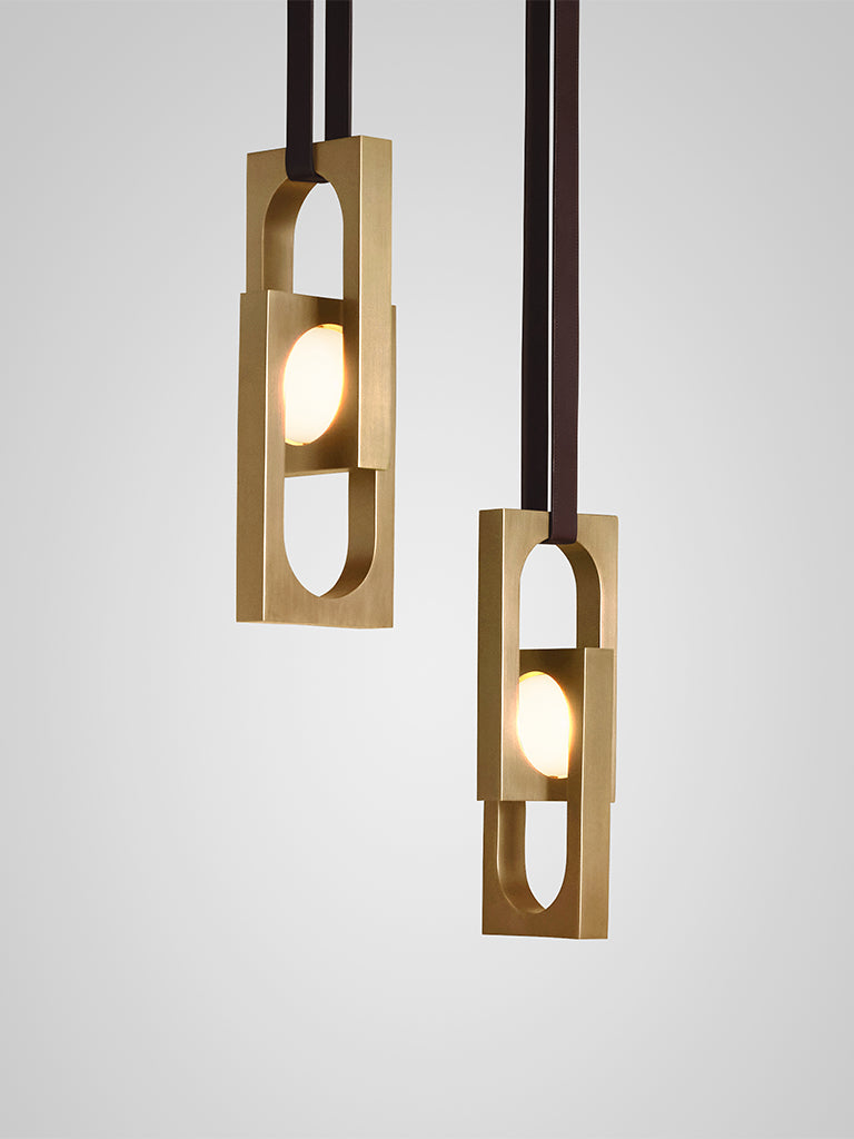 Mythos is a brass pendant light formed of one or two sculptural interconnected links capturing an illuminated glass orb. Mythos Duo is suspended from a hand-stitched leather strap which acts as a sling for the links, concealed connections make it almost impossible to determine how the orb generates its illumination.  Mythos is also available as a single pendant suspended by a cord.