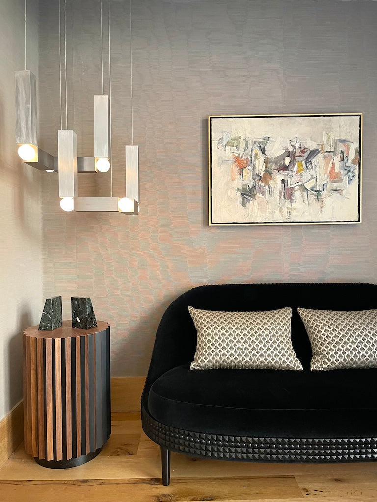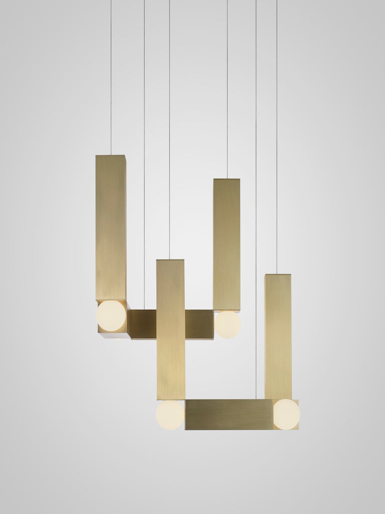 Vesper is inspired by the simple geometric lines of Brutalist sculpture and modernist cathedral lighting. Formed with extruded aluminium and available in anodized gold or silver, Vesper explores the delicate balance and interconnection of its rectangular cubes that are seamlessly connected by illuminated spheres. The light sculpture, which is suspended by cables, is available in both Duo and Quattro versions.