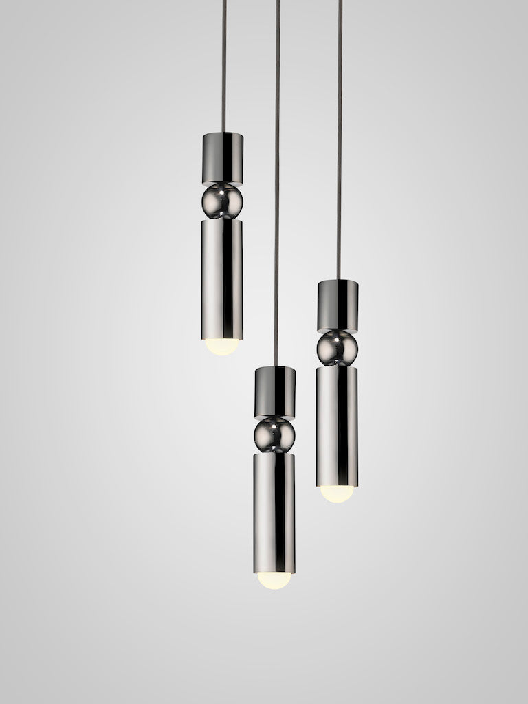 The Fulcrum Chandelier features three Fulcrum Lights suspended at set lengths from a matching finish ceiling plate and creates a dramatic cluster that is simple to install.