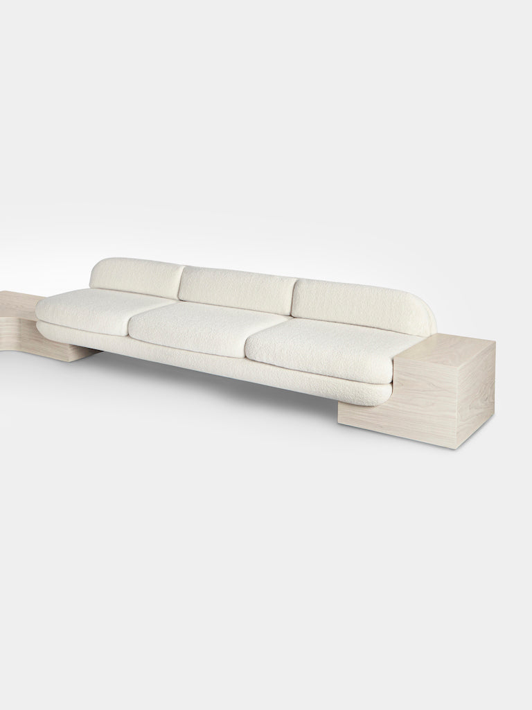 The White Street Sofa highlights Lee Broom’s long-held fascination with symmetry and seamlessness. This architectural, streamlined, modular piece can be arranged in multiple configurations and is effortlessly connected by sculpted armrests, corner or side tables, each produced in black or white ash. Shown in a sumptuous ivory bouclé by Dedar, but available in multiple colours, the sofa, with its expansive and curved back, appears to float, anchored only by its connectors. The White Street sofa is available as a two seat, three seat and corner configuration sofa.