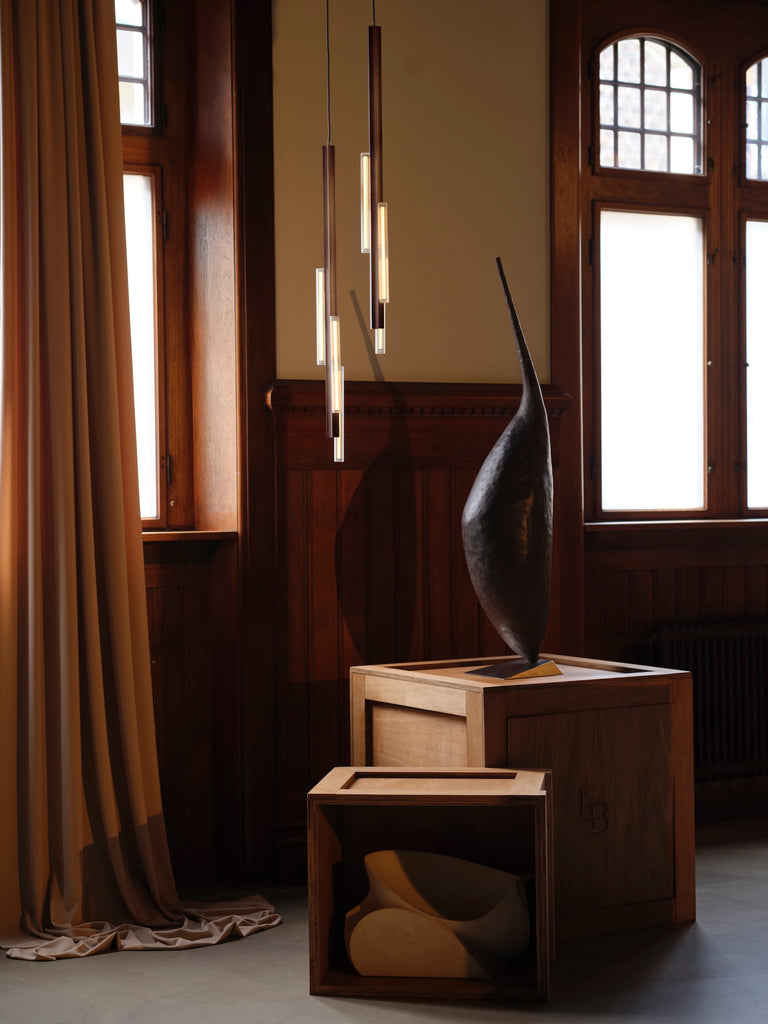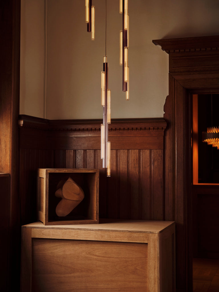 Hail is inspired by the shards of light and shadow often experienced from lancet windows in vast church arches. Available in three options - 3 Short, 3 Tall, 6 Tall - in a gold, bronze or silver brushed finish, Hail has an elongated fluted form fabricated in aluminium with asymmetrically positioned reeded glass lightbulbs placed along its structure. The lights can also be connected to create unique longer customisable configurations up to 15 feet / 4 metres in length. Longer options are also possible.
