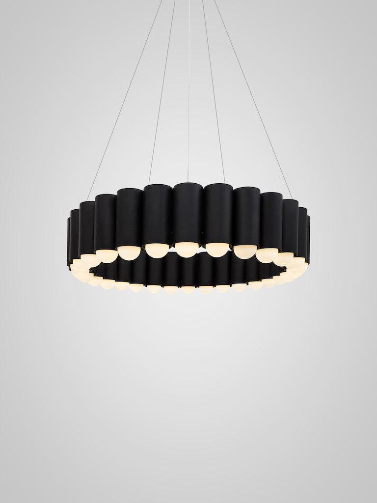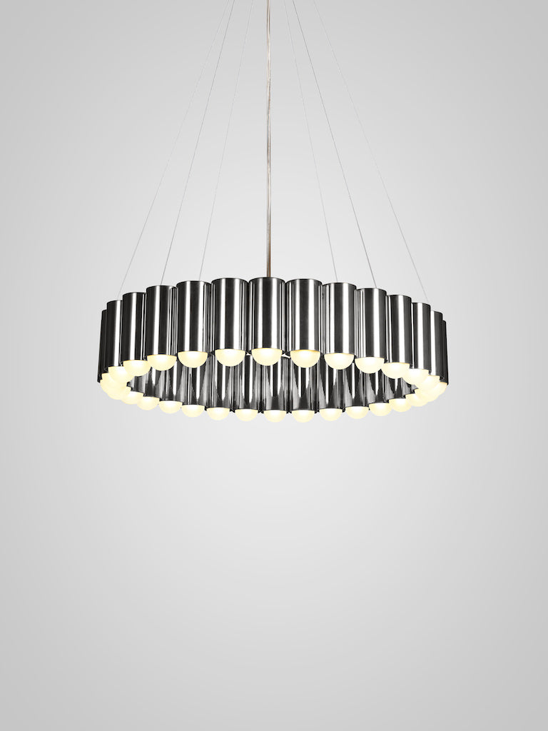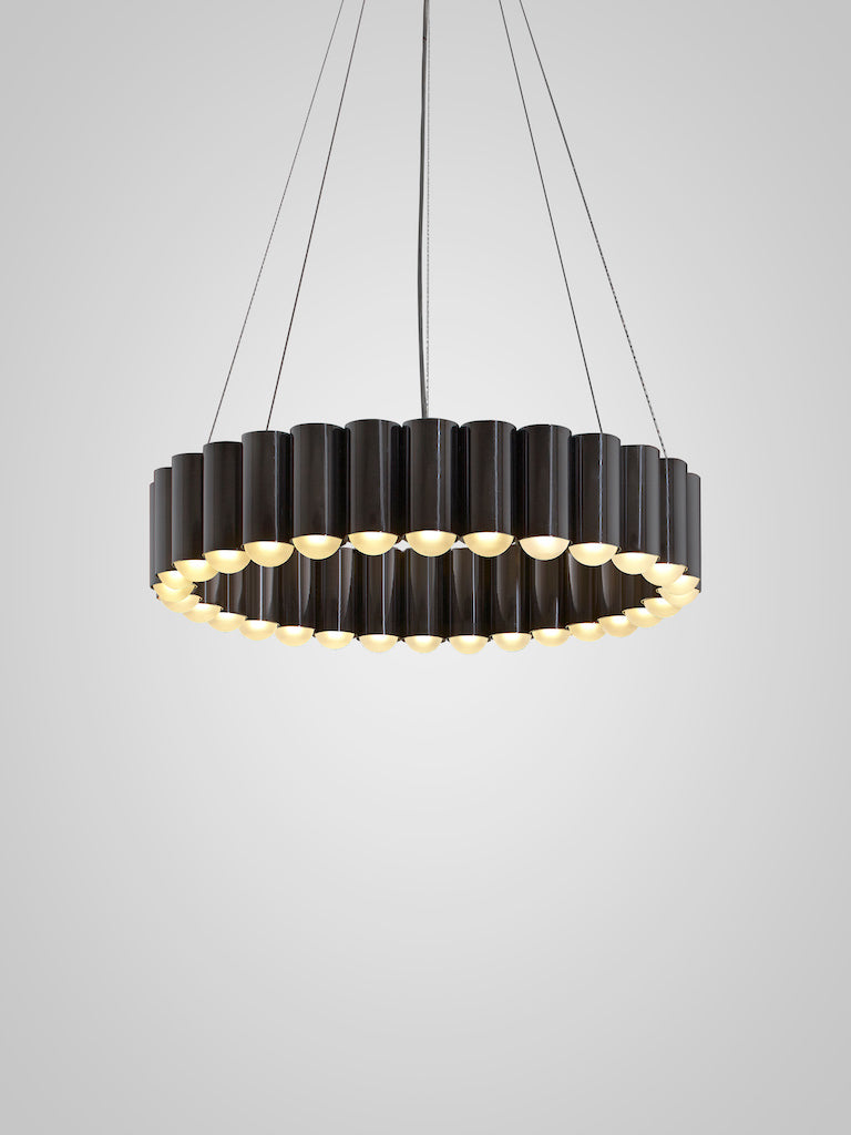 Inspired by the merry-go-round ride of a traditional British fairground, Carousel is a pendant light with a heavyweight presence that floats gently in space. Cylinders of gold, chrome, gunmetal or black each house an inset LED lighting element resulting in a spectacular yet playful ring of light. Carousel is suspended from a matching finish circular ceiling plate by steel suspension wires with a single clear cable.