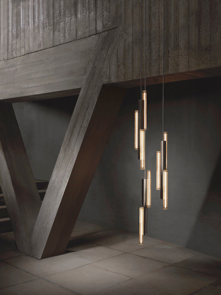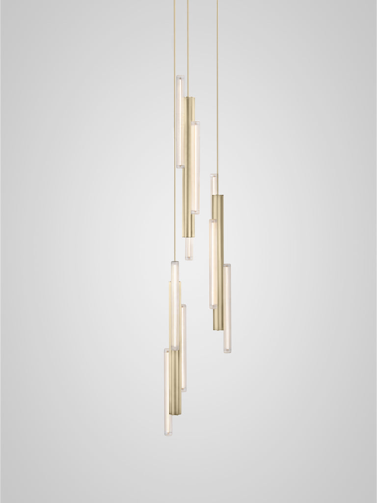 Hail is inspired by the shards of light and shadow often experienced from lancet windows in vast church arches. Available in three options - 3 Short, 3 Tall, 6 Tall - in a gold or silver brushed finish, Hail has an elongated fluted form fabricated in aluminium with asymmetrically positioned reeded glass lightbulbs placed along its structure. The lights can also be connected to create unique longer customisable configurations up to 15 feet / 4 metres in length. Longer options are also possible.