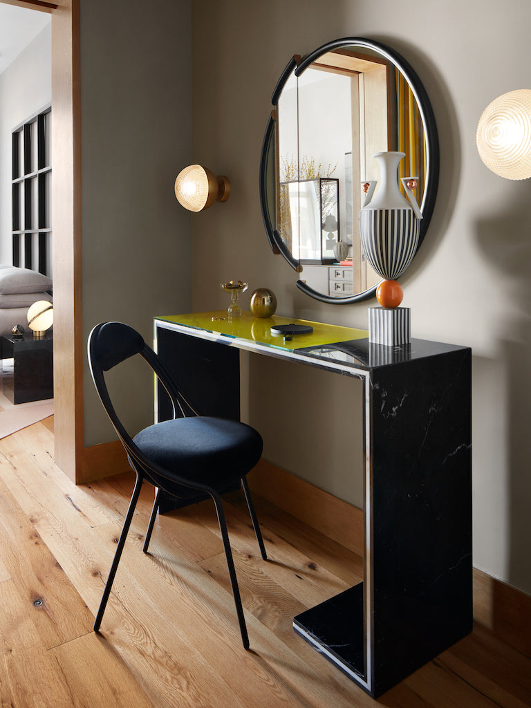 A precision cut slice, shifted from its original position reveals an oak trimmed section of the black frame on Split Mirror.