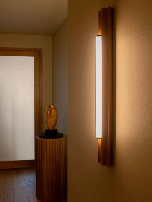 Altar is an exploration into the angular forms of Midcentury churches and altars, which often looked to warmer natural materials for fonts and pews. Altar’s elegant, fluted form is carved from solid oak and completed with an illuminated tube seamlessly nestled in its architectural grooves. The light is available as a surface mounted wall light, or as a pendant in three sizes.
